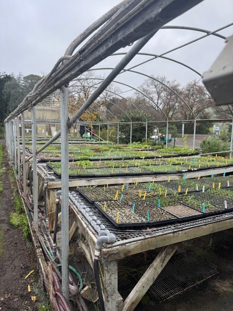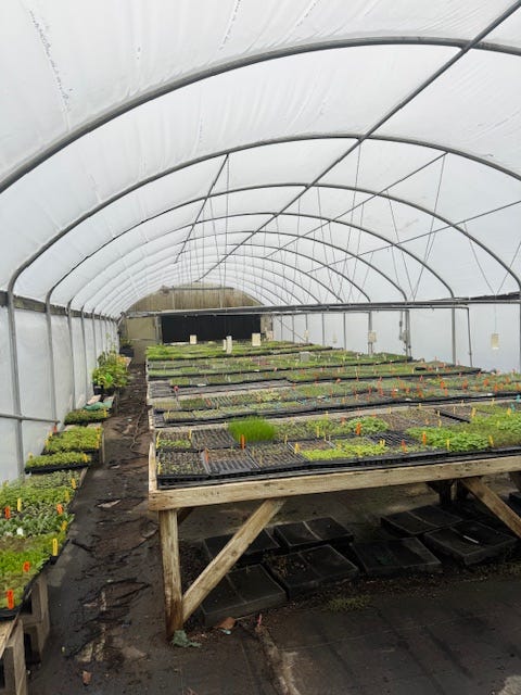 We had one dry, non-drippy no fog day finally this week, so we had enough time to strip off the old plastic from our propagation greenhouse and pull over a new ‘skin’. It is two layers of plastic with an inflator fan to blow air between the two layers to create a layer of insulation for heating. It takes 5 people to properly put the plastic on this small 20 ft x 65 ft greenhouse, hopefully we will get 4 to 5 years from this covering!