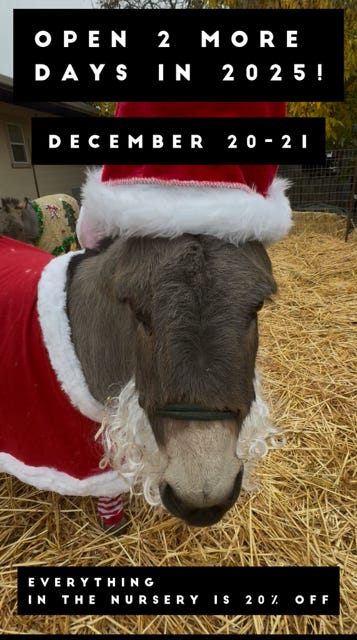 We are open only 2 more days this year, Saturday and Sunday, December 20th-21st. We have sales throughout the nursery, everything in the nursery is 20% off! And if you are checking out at the register and it is raining (highly likely this weekend) be sure to ask for the Rainy Day Discount to receive an additional 10% off.
