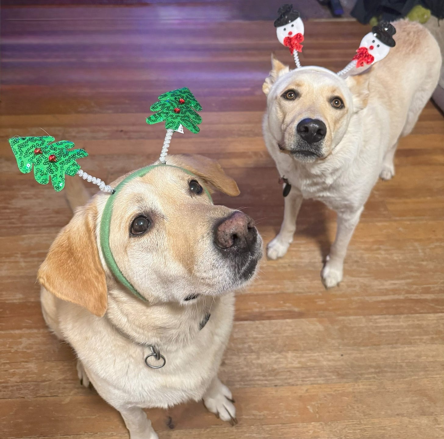 Just a few more days until Christmas, are you still baking, cooking, shopping or cleaning your home preparing for guests? Yes, yes, yes and yes, but there is always enough time to put funny headbands on the pets and take several hundred photos of them. Here are my two pups, Dexter and Noodle.